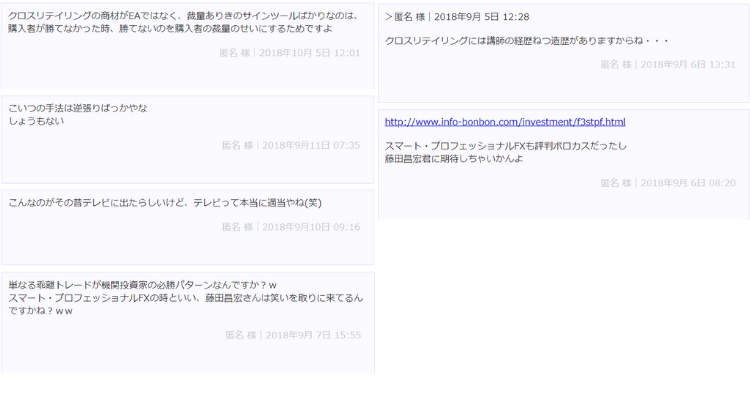 藤田昌宏氏は前述したとおり、「スマプロFX」「キングダムFX」「スマート・リターンFX」等のFX投資案件をリリースしているのもあり、グーグルやSNS等で調べれば口コミ・評判が出てきます。
