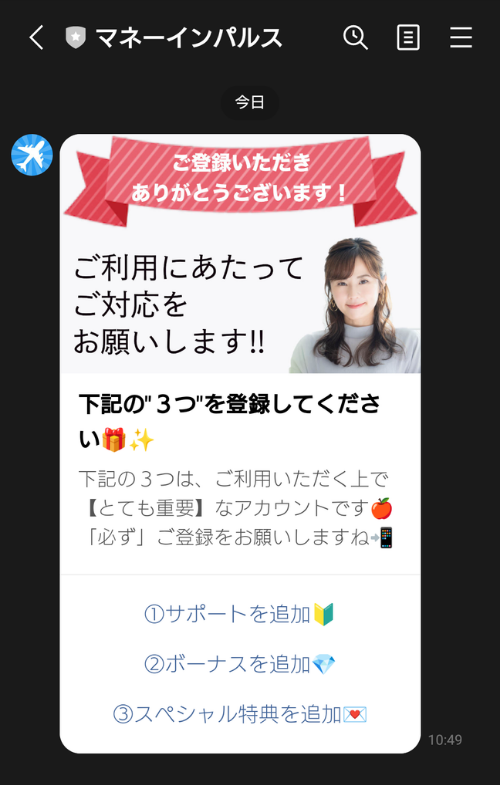 マネーインパルスの公式LINEに登録すると、以下のメッセージが届きます。