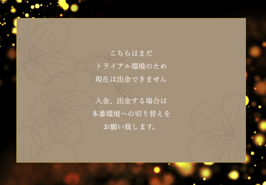 恐らく、出金するためには本番切り替えが必要ですと案内され、高額なバックエンドに導かれるのがオチでしょう。