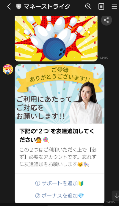 マネーストライク(MONEY STRIKE)の公式LINEに登録すると、以下のように2つのアカウントに新たに登録するよう要求されます。