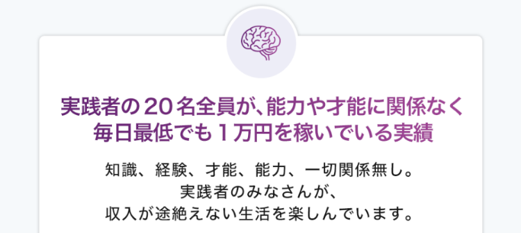 また、実践者の20名全員が稼いでいるそうですが、それを示す信用できる証拠は一切ありません。