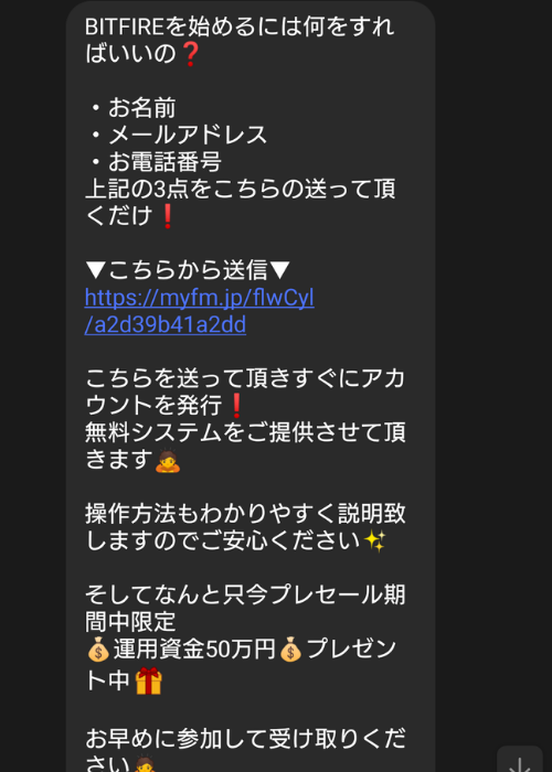 というか、メッセージをよく見ると、LPでは10万円プレゼントとなってますが、50万円プレゼントとなってますね・・・。