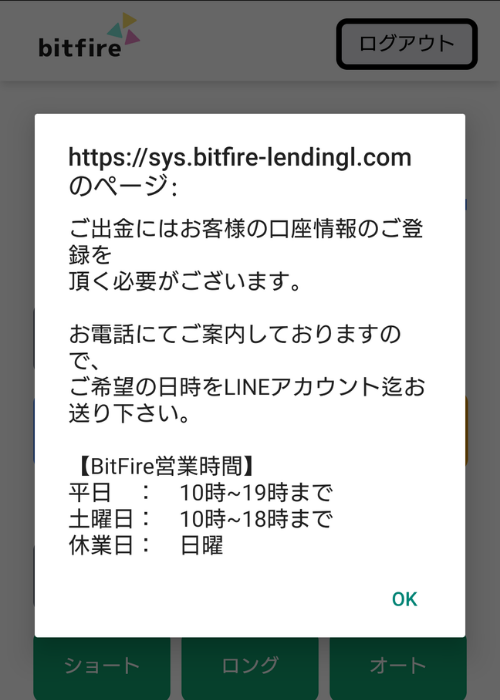 また、「出金する」のボタンを押すと以下のメッセージがでます。