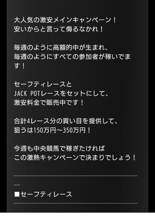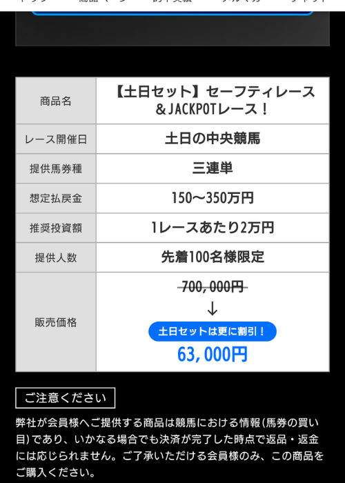 もし、MEGA BUCKS(メガバックス)の商品を購入して予想が外れると、土日の2日間だけでかなりの金額を散財することになりますので、非常にリスクが高いと言えます。