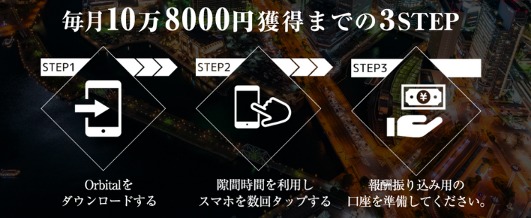 このOrbital(オービタル)は、スマホ1台で毎月10万8000円稼げると豪語してますね。