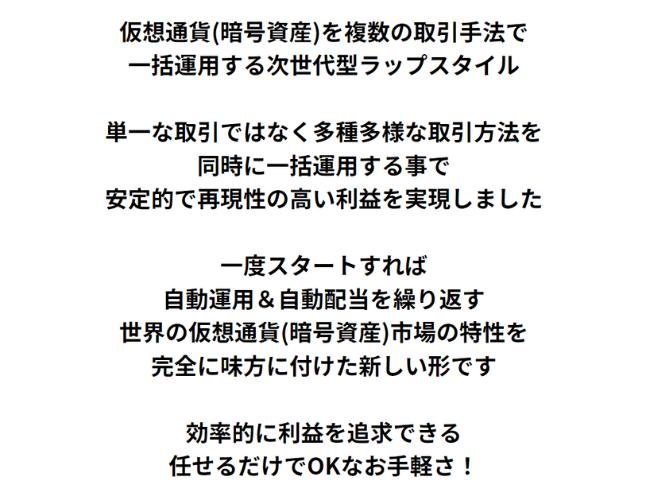 「仮想通貨を複数の取引手法で一括運用する次世代型ラップスタイル」だそうです。