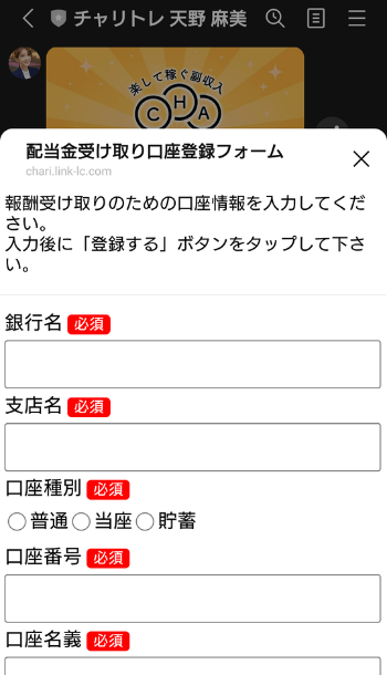 ここで口座情報を登録すると、チャリトレ(CHARITORE)についての説明を見ることができるようになります。