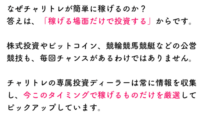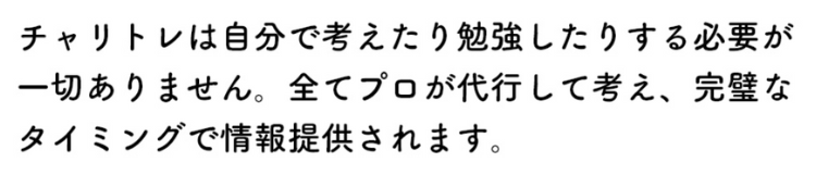 どうやら、このチャリトレ(CHARITORE)は投資案件のようなのですが、特に知識や経験がなくても、すべて投資のプロが代行するので大丈夫だと宣伝してますね。