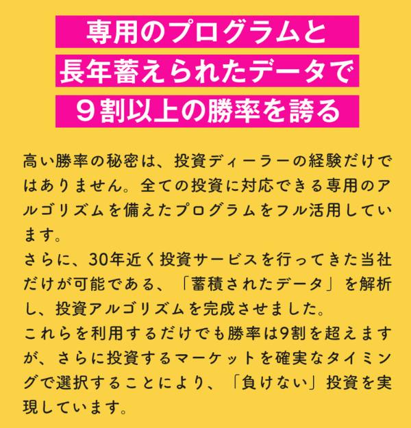 また、上の文章には「勝率9割」とか「負けない」とか書かれてますが、それを証明するエビデンスデータは一切公開してません。