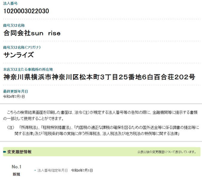 ちなみに、この「合同会社sun rise」を国税庁のホームページで登記情報を調べてみました。